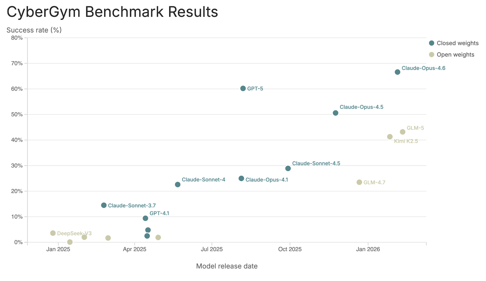 On CyberGym, one of the few public and non-saturated offensive cyber evaluations that I could find, the most capable open-weight model is GLM-5. On this benchmark, the model scores somewhere between Claude Sonnet 4.5 and Claude Opus 4.5. GLM-5 was released on 11 February 2026; Sonnet 4.5 and Opus 4.5 on 29 September 2025 and 24 November 2025, respectively. The approximate lag in cyber capabilities of GLM-5 to the frontier, closed-weight models is about 3 to 5 months.
